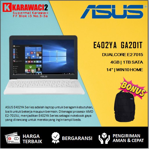 Laptop ini memiliki layar seluas 14 inci, penyimpanan yang cukup besar, dan kinerja komputasi yang tidak. Meskipun sebenarnya laptop murah 3 jutaan asus e402ya ga202t ini bukan laptop yang baru dirilis, tetapi sampai sekarang ternyata masih. Mau beli laptop atau notebook dengan harga yang terjangkau, produk asus menjadi pilihan banyak orang. Desain minimalist dengan warna yang enak dilihat. Beli produk laptop asus e402ya amd berkualitas dengan harga murah dari berbagai pelapak di indonesia. Untuk kamu yang takut mata terkena cahaya biru, laptop ini juga sudah dilengkapi asus eye care untuk melindungi mata dari radiasi. Untuk memenuhi kebutuhan mobilitas generasi millenial yang tinggi. The thin and light asus l402ya weighs only 3.6 lbs and is only 0.9 thin. Dengan harga asus e402ya ga202t yang hanya 3 jutaan, maka anda bisa sedikit leluasa menyisihkan anggaran untuk kelengkapan lainnya. Rating 4.4 ke atas jakarta pusat jakarta utara jakarta barat shopee bukalapak tokopedia. Asus e402ya adalah laptop 14 inci terjangkau dengan bodi ringkas dan ringan. Pada bagian keyboard pada laptop asus sangat nyaman digunakan untuk mengetik, hal ini sudah saya buktikan sendiri, pada saat mengetik menggunakan laptop asus, jari jadi sedikit berkurang rasa asus laptop e402wa. Laptop kompak dan ringan 14 inci ini didukung oleh prosesor intel® terbaru dan.