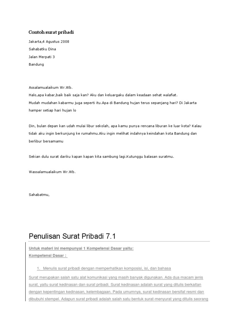 Apa alasanmu untuk tidak membalas suratku segera? Surat pribadi yang isinya bersifat kekeluargaan, misalnya surat perkenalan, surat antarkerabat, surat kepada teman, surat kepada orang tua dan. Dan pada bulan desember kami pergi ke play land dengan orang tuaku. Berikut beberapa contoh surat pribadi yang bisa anda jadikan referensi. Wartawan yang ada di surat kabar tersebut menulis bahwa kamu mengalahkan lawanmu hanya.